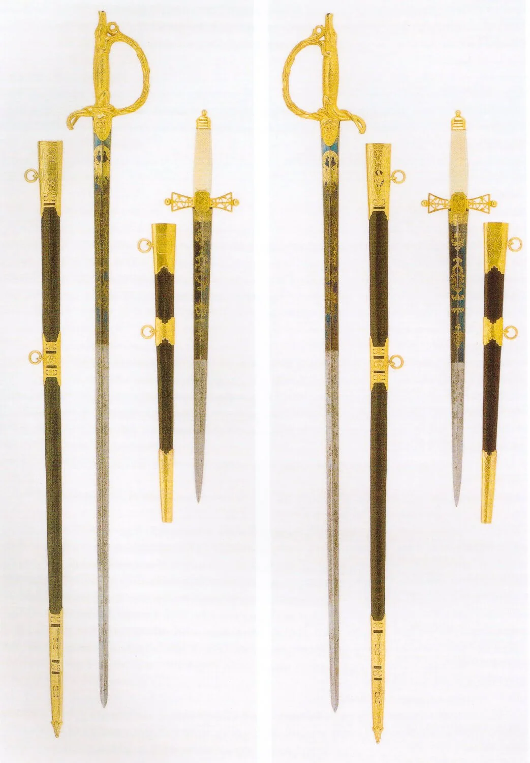 The collections of the National Maritime Museum contain three examples of the Egyptian Club sword, one of which can be definitely linked to Captain Samuel Hood of HMS Zealous (Acc. No. WPNI550), one of which can probably be connected with Alexander Davison (Acc. No. WPN 1093) and the other of which (Acc. No. WPN 1094) cannot be connected with an identified individual, although- interestingly and perhaps significantly - its spadroon blade is very similar indeed to that on our sword. A fourth example of the Egyptian Club sword is known, that belonging to Captain James Saumarez (exhibited as item no. 143 in the exhibition Rule Britannia! A loan exhibition of Marine Works of Art, at Sotheby's, London in .January 1986). Notably, the two Egyptian Club swords that can be associated with Nile captains -Hood's and Saumarez's -have similar, saber-blades. The second of Davison's swords was sold at Sotheby's, London, in 2002 (The Alexander Davison collection, 21 October 2002, lot 13); another sword purportedly associated with the Egyptian Club is recorded as also having been sold by Sotheby's, London, in 1919 (22na December1919,1ot 185).
